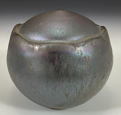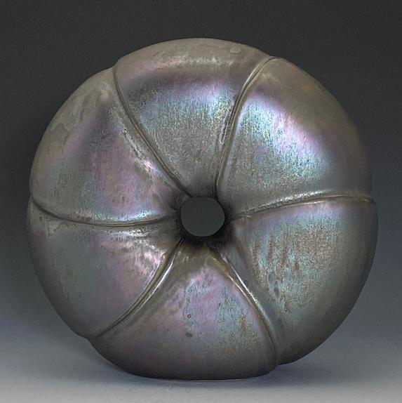 High-fire stoneware body with multiple-layered glazes. Wheel-thrown to create enclosed hollow walled piece. Altered and carved.